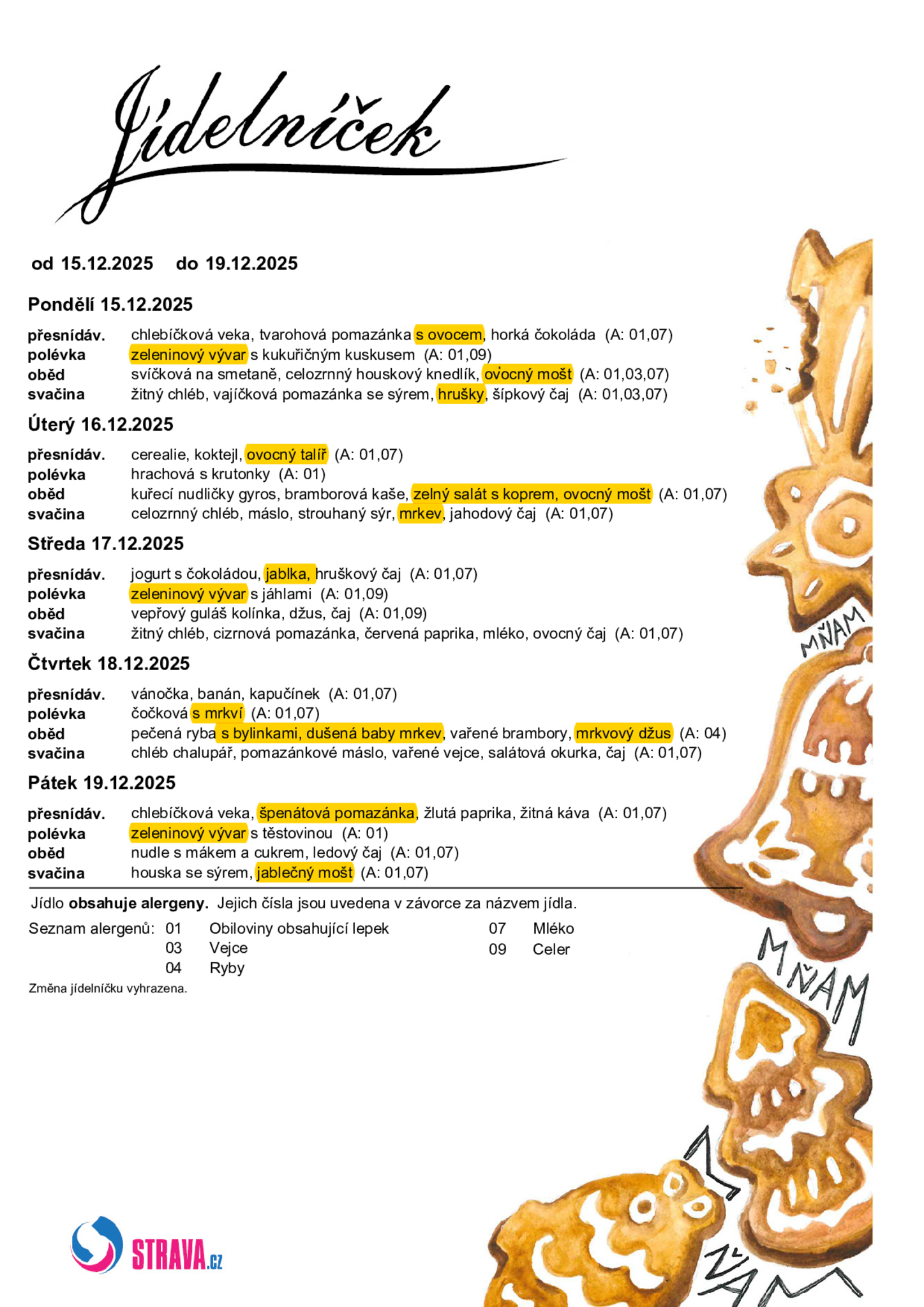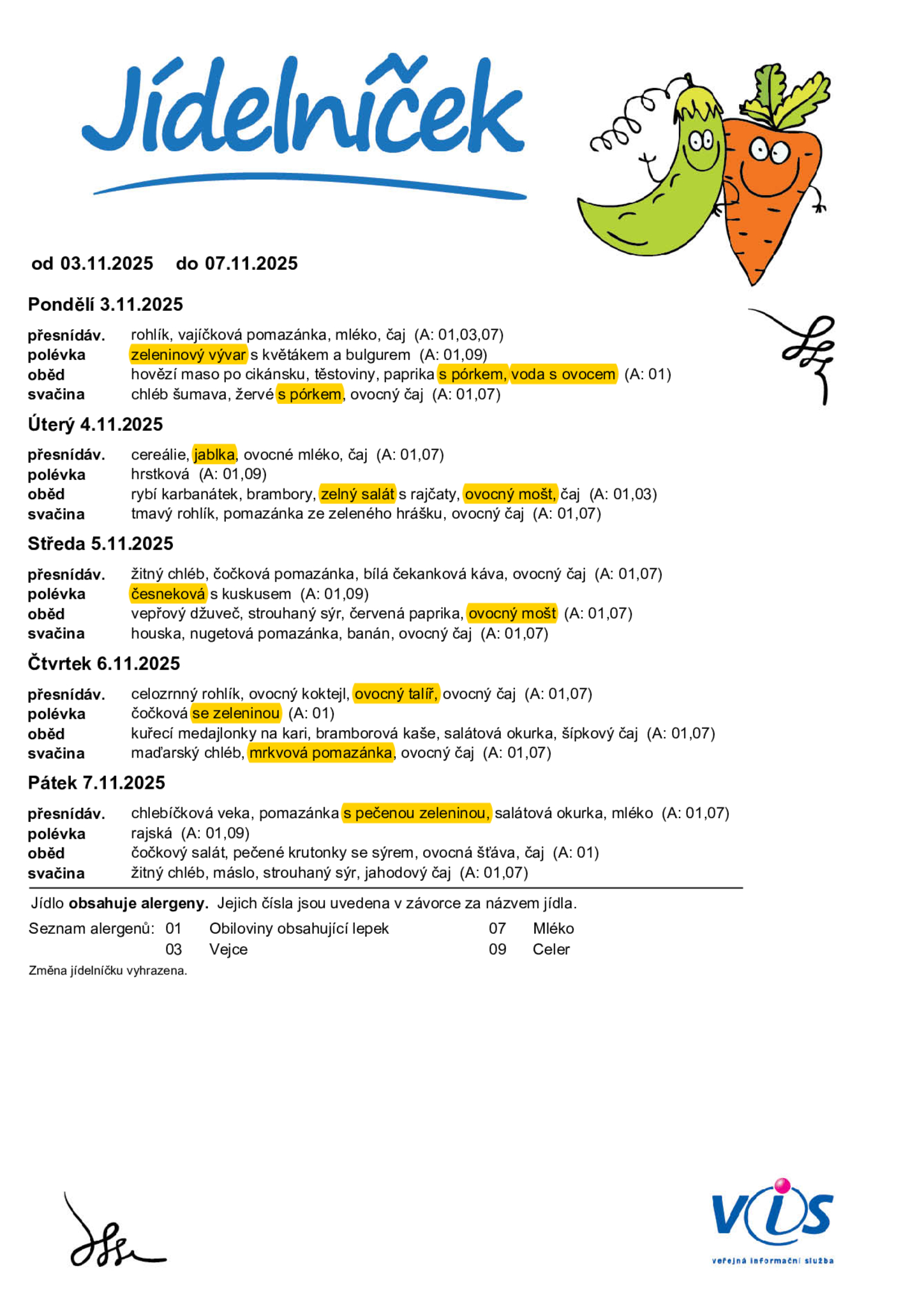 V jídelním lístku jsou žlutě označeny současné sezonní bylinky, ovoce a zelenina (které jsou obsaženy v jídle v čerstvé podobě nebo skladem), jak dozrávají v regionu České republiky podle sezonního kalendáře.